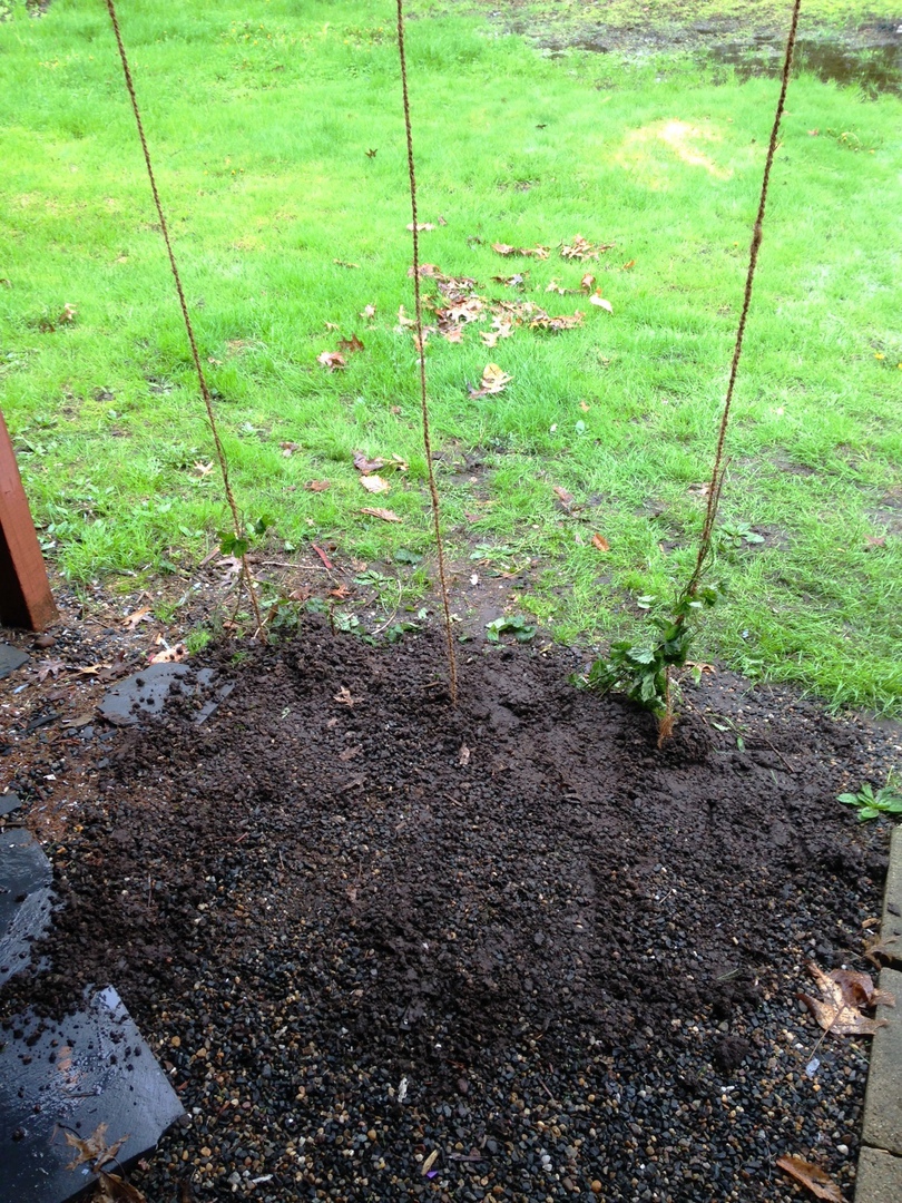 Cascade hop rhizomes are planted around old oak tree, to take advantage of the tree's height to string up the twine. This is a problematic area because the old oak tree has big roots that will inhibit rhizome growth. I must build up the soil in this area with permaculture techniques to raise the level of the soil, and also increase soil health.